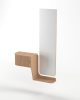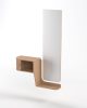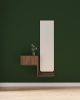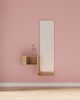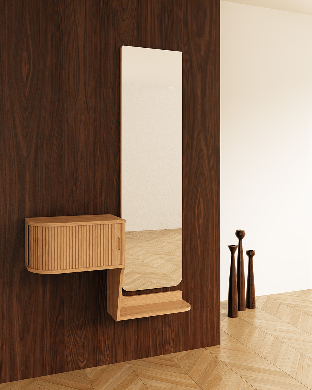 The Hallway 127 storage compartment features a tambour sliding door that rolls seamlessly into the back, a nowadays rare technique that is not only pleasing to the eye but is also functionally ideal as it minimizes the space needed. A vertical wall mirror on a frame of wood with finger-jointed corners is further visual proof of high quality cabinetmaking.